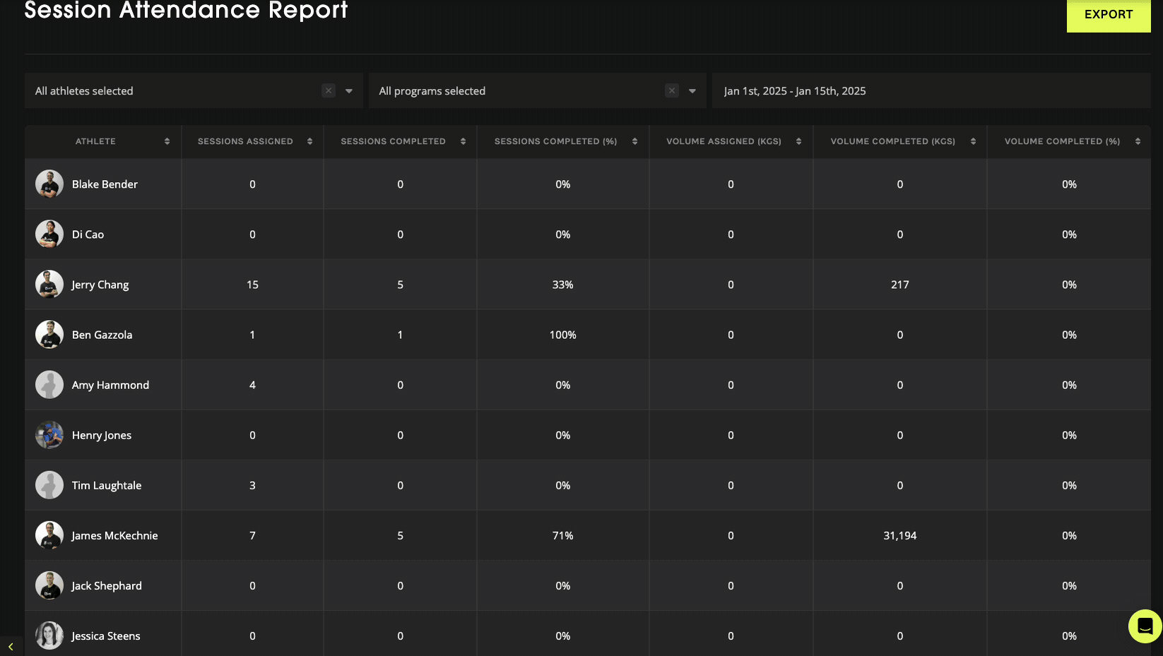 The Session Attendance Report gives you rapid insight into session and progression compliance. You can view volume and attendance in a ‘planned vs completed’ format.