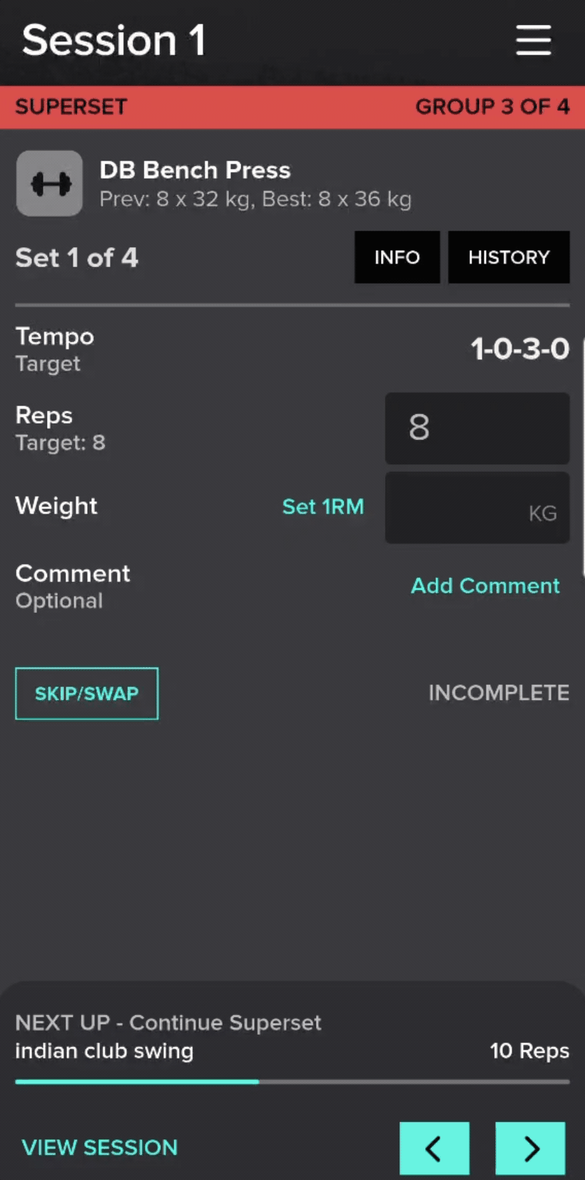The Sessions tab gives you an overview of each athlete’s workout progressions including sets skipped, exercises swapped and athlete notes. All in one location. If you want a little more information, you can dig deeper into individual sessions and view set-by-set results as captured by your athlete.